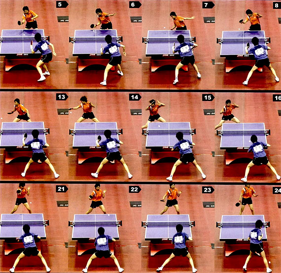 組圖中,丁寧發(fā)逆?zhèn)刃氤雠_球到李曉霞中路(圖1—5)。李曉霞接發(fā)球時(shí)的判斷略微遲緩,當(dāng)她發(fā)現(xiàn)來球?qū)⒊雠_,于是加強(qiáng)摩擦,勉強(qiáng)地將球掛起(6—10)李曉霞雖然提前上手,但是由于要將回球弧線控制得低平,這板進(jìn)攻的速度和落點(diǎn)都沒有優(yōu)勢。丁寧抓住機(jī)會(huì),在來球上升期擊球,快撕到李曉霞正手位大角(圖1—13)。李曉霞采用跨步連續(xù)正手拉球,此時(shí)她的進(jìn)攻已經(jīng)被丁寧壓制住,正手拉球幾乎只能靠手臂的動(dòng)作來調(diào)節(jié)(圖14)。擊球瞬間,李曉霞靠轉(zhuǎn)身來控制回球線路(圖15)而此時(shí)丁寧早已做好下一板的準(zhǔn)備。由于李曉霞的回球質(zhì)量比較低,丁寧順勢用反手頂一板直線(圖16—19),李曉霞由于失去身體重心,起動(dòng)速度較慢,在回球時(shí)錯(cuò)過了最佳的擊球點(diǎn),被來球頂住(圖20),回球失誤(圖21—24)。www.qikan.com.cnIXDQnXrkEDA3q8TA