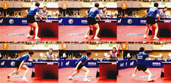 正手連續(xù)進(jìn)攻時(shí),腳下的移動(dòng)范圍比較小,此時(shí)可以不用交叉步,而是用跨步。下列組圖中,柳承敏轉(zhuǎn)腰引拍后,身體重心從右腳移動(dòng)到左腳,并沒有使用交叉步,這樣可以避免身體向右側(cè)傾斜,而且可以快速還原,有利于快速連續(xù)進(jìn)攻。