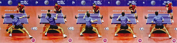 組圖G為馬林側(cè)擠弧圈球的實例,直板反手側(cè)擠是一項技巧性很強(qiáng)的防守技術(shù),尤其在防守弧圈球的時候可以改變回球的節(jié)奏和旋轉(zhuǎn),給對方造成不小的威脅。對業(yè)余選手來說,掌握反手側(cè)擠的技術(shù)至關(guān)重要。