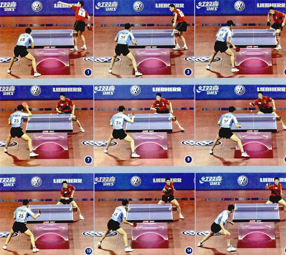 與組圖A相比較,在比賽中搶先上手的選手都贏得了這一分。在這套組合中,吳尚垠的套路雖然與組圖A中王勵勤的套路相同,但是從每一板球的處理上都體現(xiàn)出他自身的技術(shù)特點。首先吳尚垠在第一板接發(fā)球搶攻時的擊球點略早,雖然拉球的力量不大,但是相對速度較快。從拉球落點上看,吳尚垠第一板拉球前觀察了王勵勤的站位,因此拉到對方中路位置給王勵勤的回球造成了不小的威脅。王勵勤第一板在位置不佳的情況下回球給吳尚垠的連續(xù)進(jìn)攻創(chuàng)造了機會。吳尚垠的第二板反手快撕在來球的上升期擊球,利用突然的爆發(fā)力加快了回球的速度。這板反手快撕在落點上同樣非常刁鉆,壓住了王勵勤的反手大角。雖然王勵勤快速后退,并有意識地壓吳尚垠正手空當(dāng),但由于來球速度很快,王勵勤無法及時調(diào)整到最佳的站位,擊球動作也略為遲緩,因此回球失誤。吳尚垠在反手快撕之后快速側(cè)身,準(zhǔn)備好連續(xù)進(jìn)攻。在這套組合的運用中,吳尚垠體現(xiàn)出速度快、落點多變的特點。