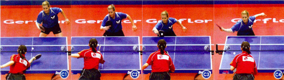 組圖C為鮑羅斯的反手臺(tái)內(nèi)拉球。鮑羅斯身高臂長,擅長中、遠(yuǎn)臺(tái)的相持,反手弧圈球的進(jìn)攻性很強(qiáng),力量大、旋轉(zhuǎn)強(qiáng)烈。在處理臺(tái)內(nèi)短球時(shí),鮑羅斯依靠身高的優(yōu)勢(shì)可以實(shí)現(xiàn)全面的進(jìn)攻。擊球前,預(yù)先判斷來球的