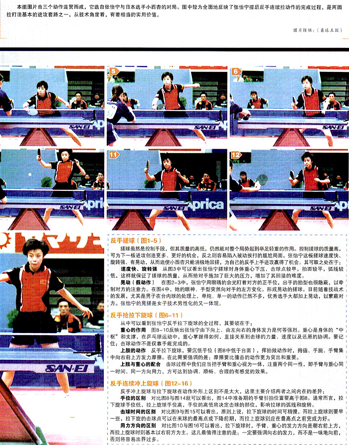 本組圖片由三個(gè)動(dòng)作連貫而成,它選自張怡寧與日本選手小西杏的對(duì)局。圖中較為全面地反映了張怡寧搓后反手連續(xù)拉動(dòng)作的完成過(guò)程。