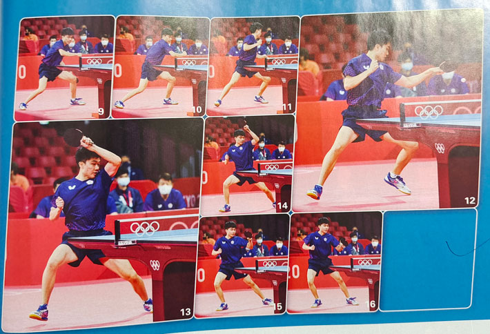 如圖1-3,林畇儒站住位置,隨著來球完成二次找球調(diào)整。圖2-5中,他在移動中進行反手搶拉。在這里我們可以關(guān)注一下他的雙腳隨著搶拉動作靈活調(diào)整的過程,充分保證了適度的擊球空間。同時,他的大腿和腰腹在全部擊球過程中一直處于極為穩(wěn)定的狀態(tài),保證擊球動作的質(zhì)量。擊球時,他町準來球,使用手臂帶動手腕做功,精確把握出手時機集中用力,并在觸球瞬間通過板形外翻的調(diào)節(jié)協(xié)助手腕摩擦岀合理弧線,利用旋轉(zhuǎn)和輕重力量的調(diào)控搶拉弧線的長短,充分展現(xiàn)了手上控球能力。