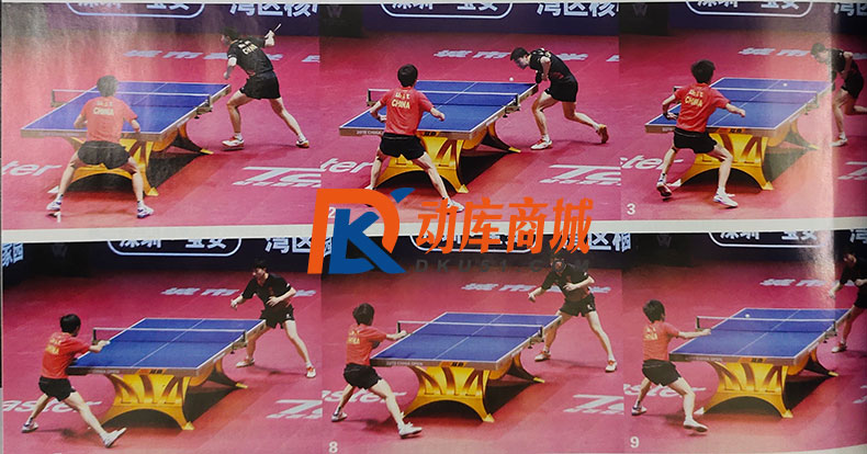 如圖14-15,馬龍?jiān)趯?duì)方擊球前,進(jìn)行預(yù)判式地側(cè)身起動(dòng)。他用右腳蹬地側(cè)身,板形也轉(zhuǎn)換到正手,使用開放式的正手站位進(jìn)行銜接,體現(xiàn)了超前的連續(xù)進(jìn)攻意識(shí)。除了先手利用托撕落點(diǎn)限制對(duì)方的回球角度外,馬龍還在后手通過靈活的側(cè)身調(diào)整動(dòng)作,防范對(duì)方有可能打出的直線落點(diǎn)。圖14-16中,馬龍?jiān)趥?cè)身的時(shí)候沒有急于踩實(shí)位置,而是隨著球的節(jié)奏調(diào)控重心,手臂始終處于可調(diào)節(jié)的放松狀態(tài),使其能夠隨時(shí)撲向自己的正手空當(dāng)。這種隨球調(diào)整的方式保證了動(dòng)作的靈活性,也是一種閱讀比賽和防范危險(xiǎn)的能力。當(dāng)然,在連續(xù)快速的相持中敢于側(cè)身,本身就是自信的體現(xiàn)。